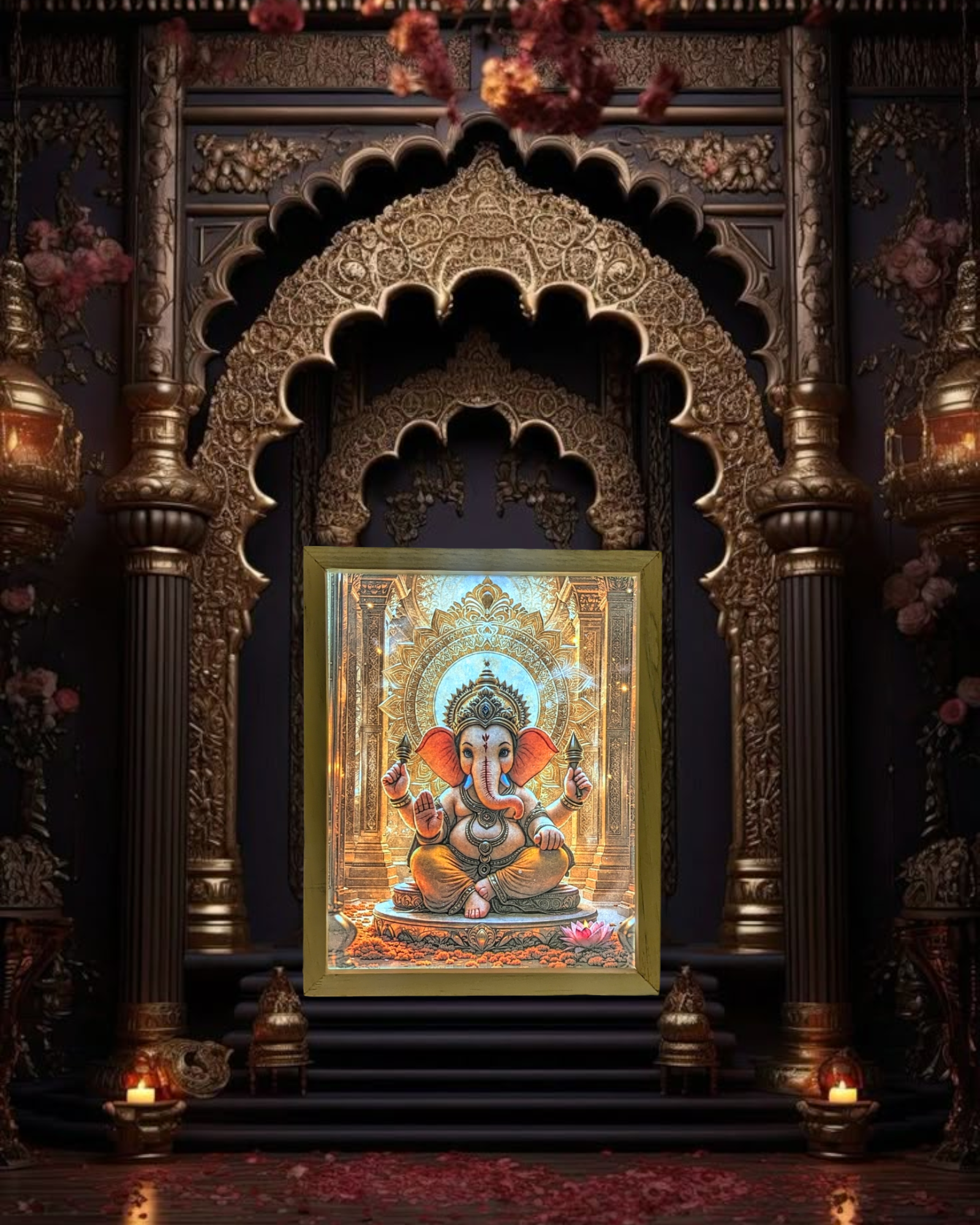 Experience divine elegance with the Royal Golden Ganpati Night Lamp. Crafted with intricate golden temple-style artwork, this lamp radiates prosperity and peace. A perfect centerpiece for your home temple, living room, or as a spiritual décor piece.